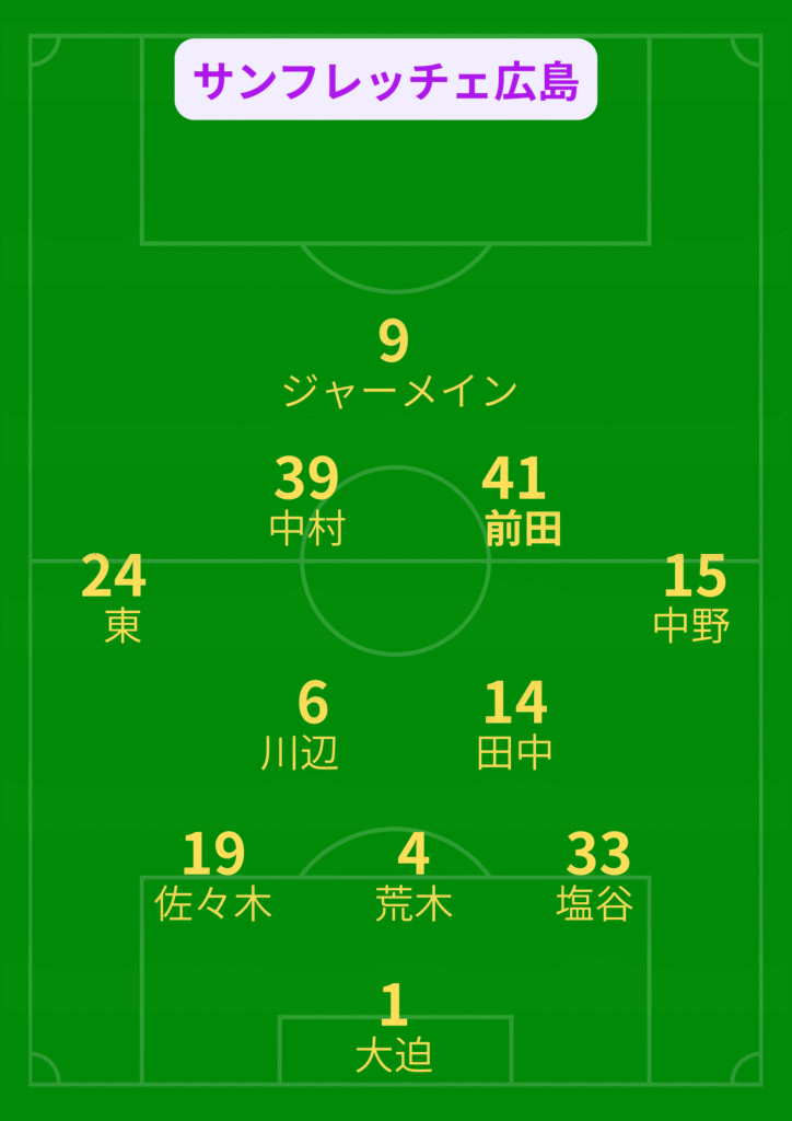 後半66分サンフレッチェ広島は前田選手に替え木下選手を入れます。そのあと72分にもジャーメイン選手に替え中島選手を入れてきました。74分には中村選手が足を痛めジェルマン選手と交代しましst。ここでサンフレッチェ広島は交代枠を使い切る形となりました。
