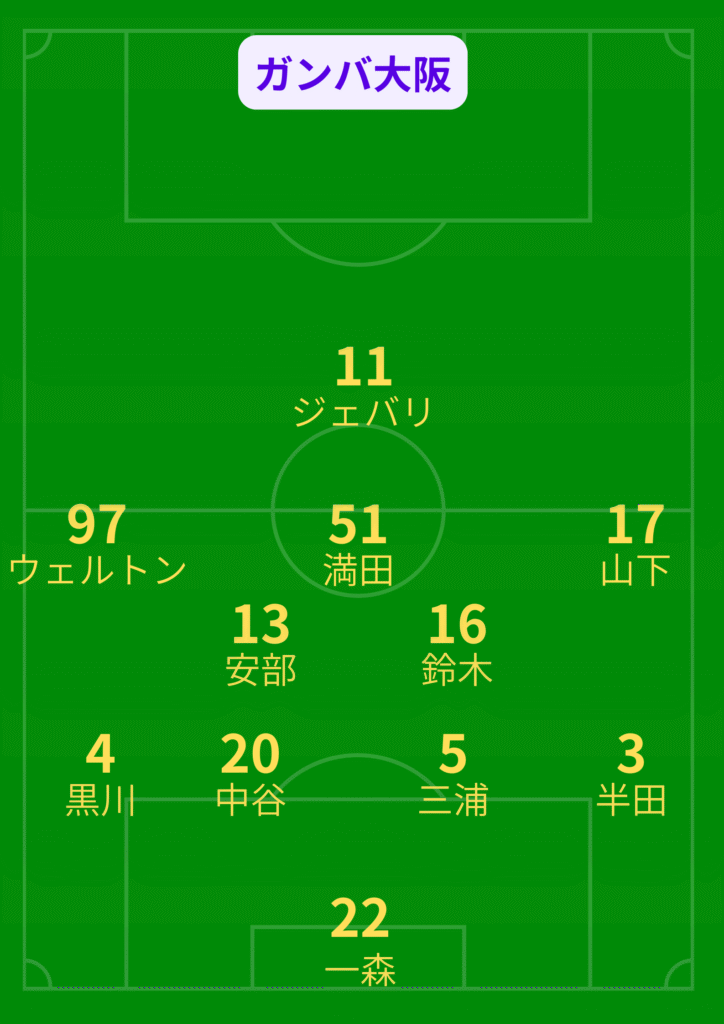 サンフレッチェ広島はウイングを東選手、中野選手、前のトライアングルをジャーメイン選手、中村選手、前田選手にしてきました。ボランチより下はいつものメンバーですね。対するガンバ大阪はヒュメット選手、倉田選手、宇佐美選手に替えジェバリ選手、山下選手、安部選手を入れてきました。安部選手は出場停止明けの試合でしたね。