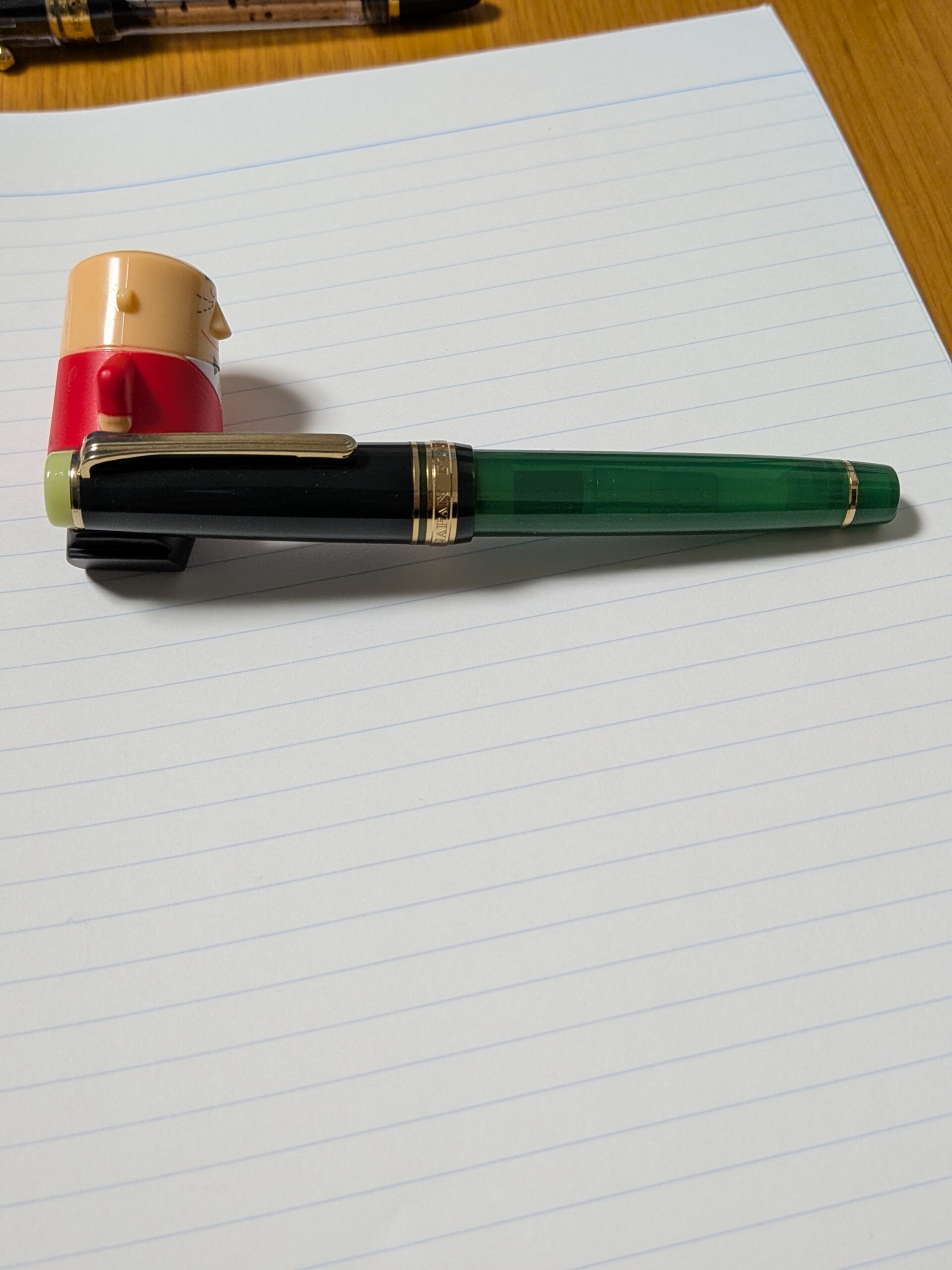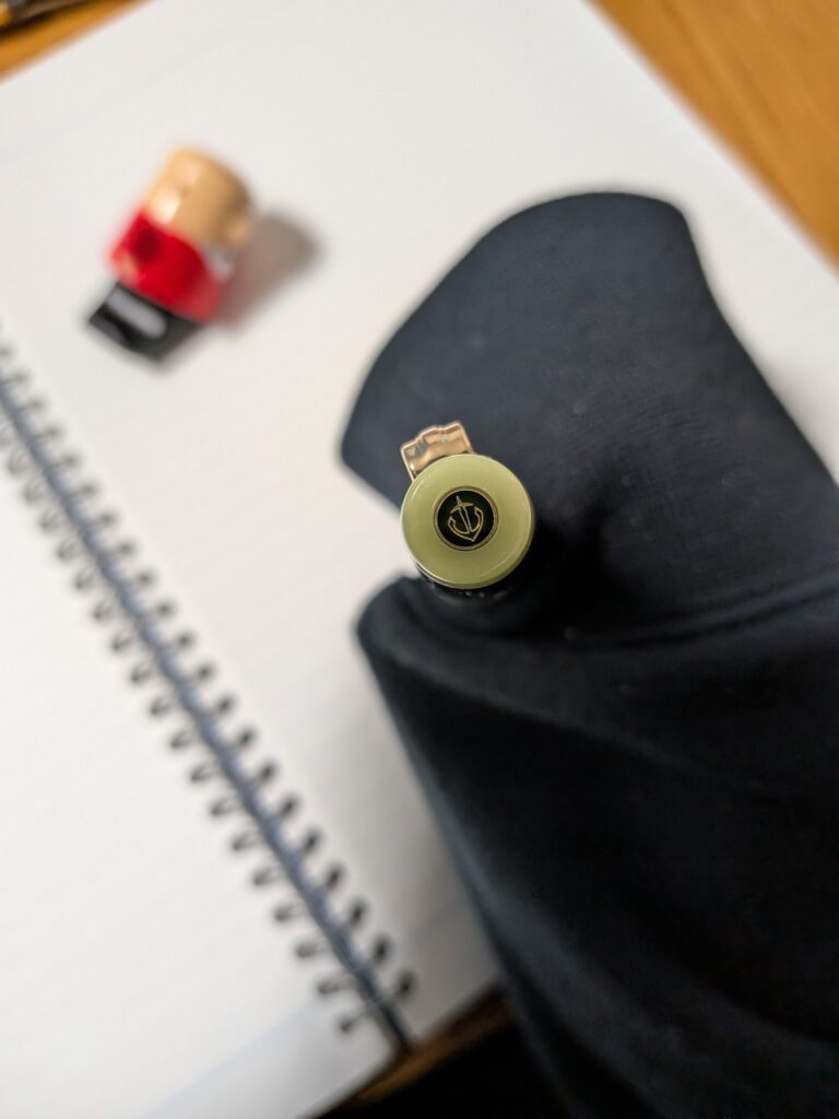 まず目を引くのが、キャップの濃い緑とボディの淡い緑のコントラスト。写真以上に実物の質感が良く、手に取るたびに満足感があります。